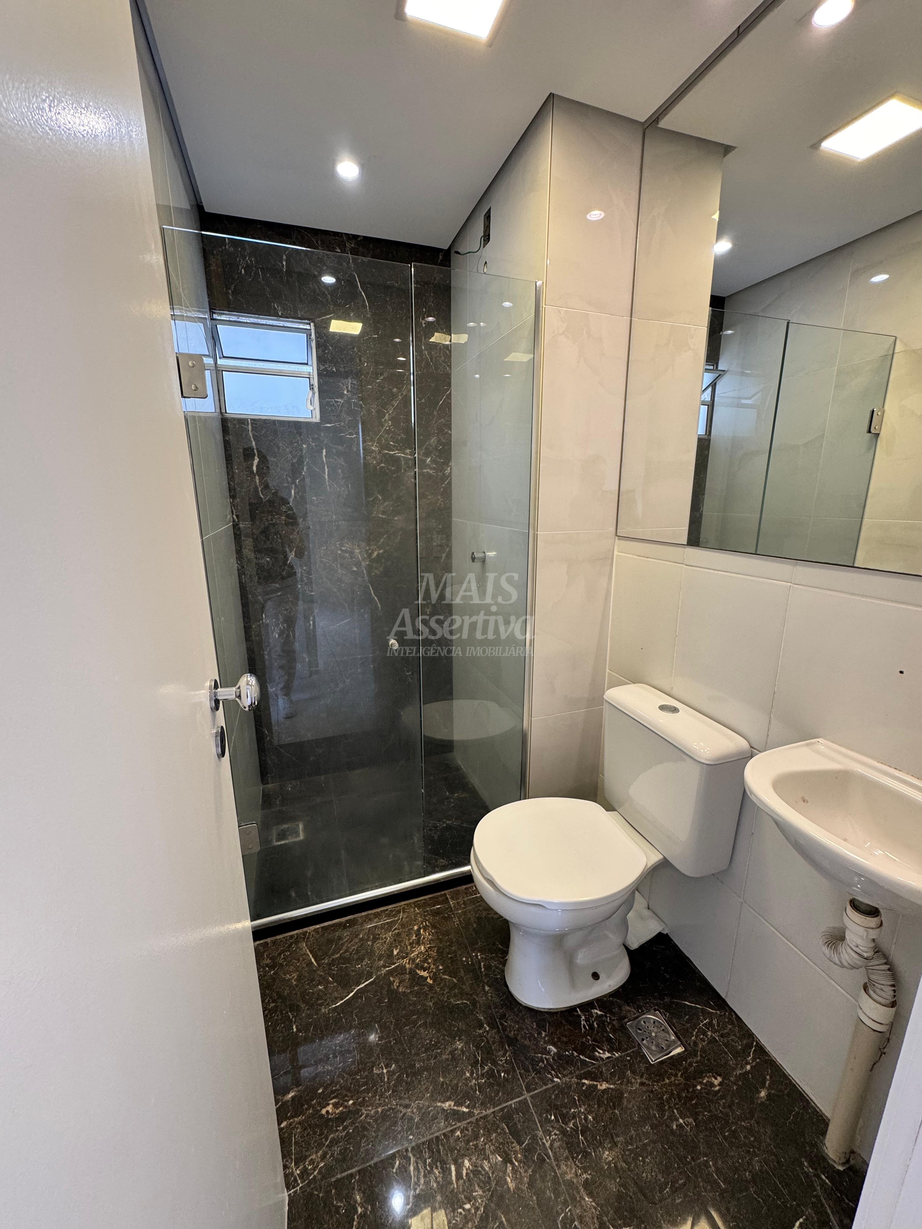 * Banheiro com box de vidro.